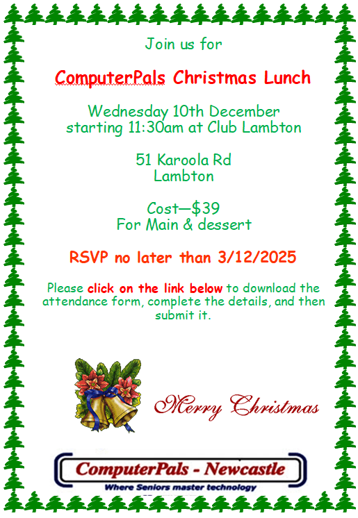 This past month we also celebrated a very successful Get Online Week with a Light Luncheon, which saw an impressive 95 attendees join us. A heartfelt thank you to our guest speakers, Olivier and Will from the Newcastle Permanent, for their informative and engaging presentation on scams, security awareness, and internet banking topics that are increasingly vital for us all.